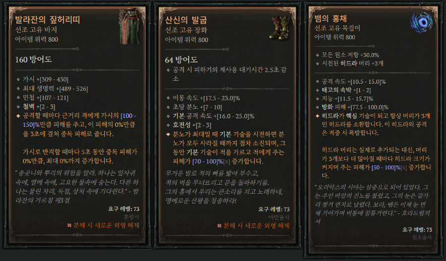 | 우버 | 궤멸자(야만,원소,강령,도적,드루), 한아비(야만,강령), 아발리온-라이칸더의 창(원소, 드루) 할리퀸 관모, 안다리엘의 두개골, 티리엘의 권능, 별 없는 하늘의 반지, 셀리그의 녹은 심장 |