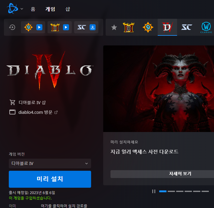 6월 1일 현재 얼리 액세스 접속 가능한 버전을 구매한 모든 게이머들은 디아블로4 사전 다운로드가 가능합니다.